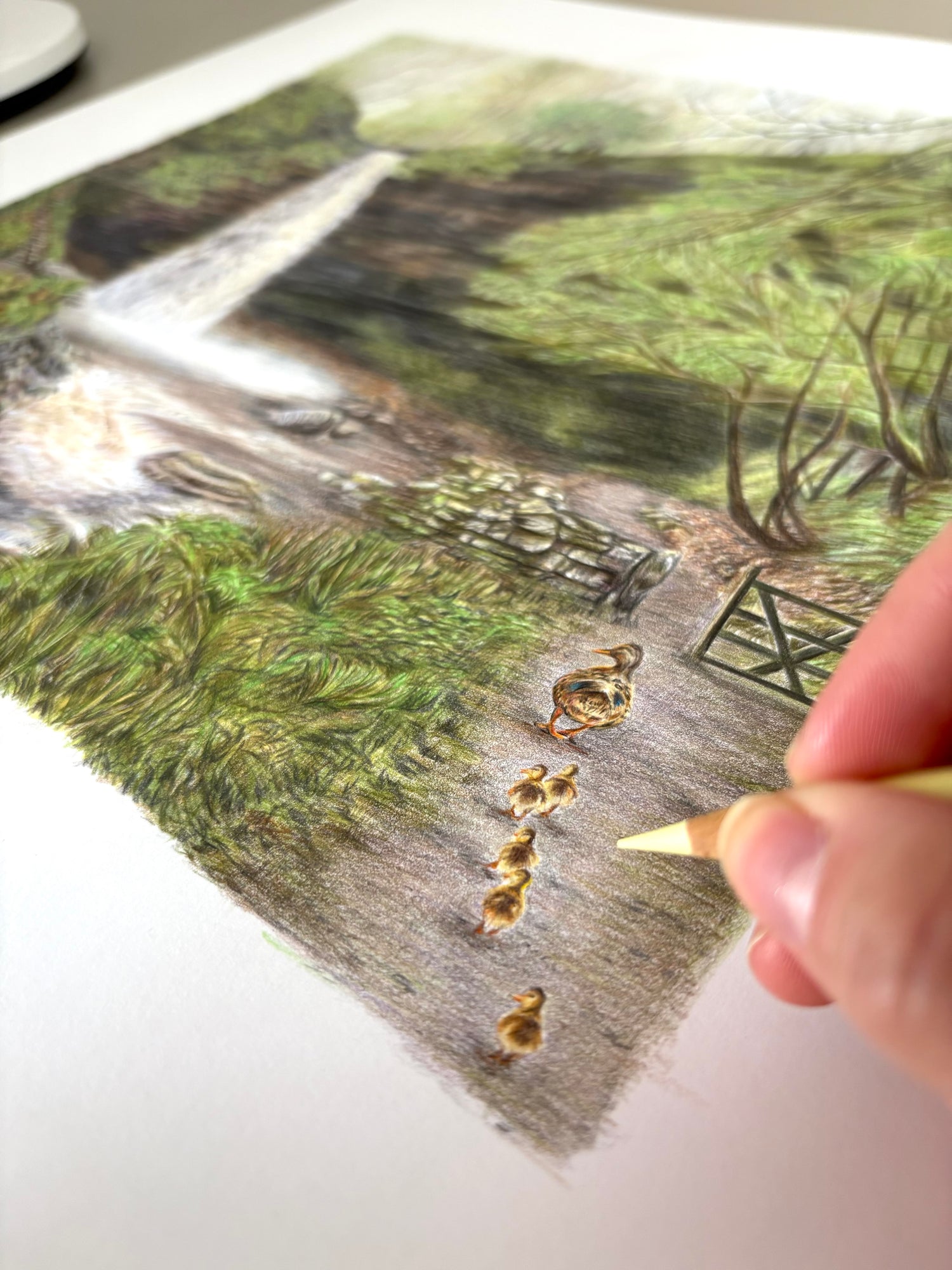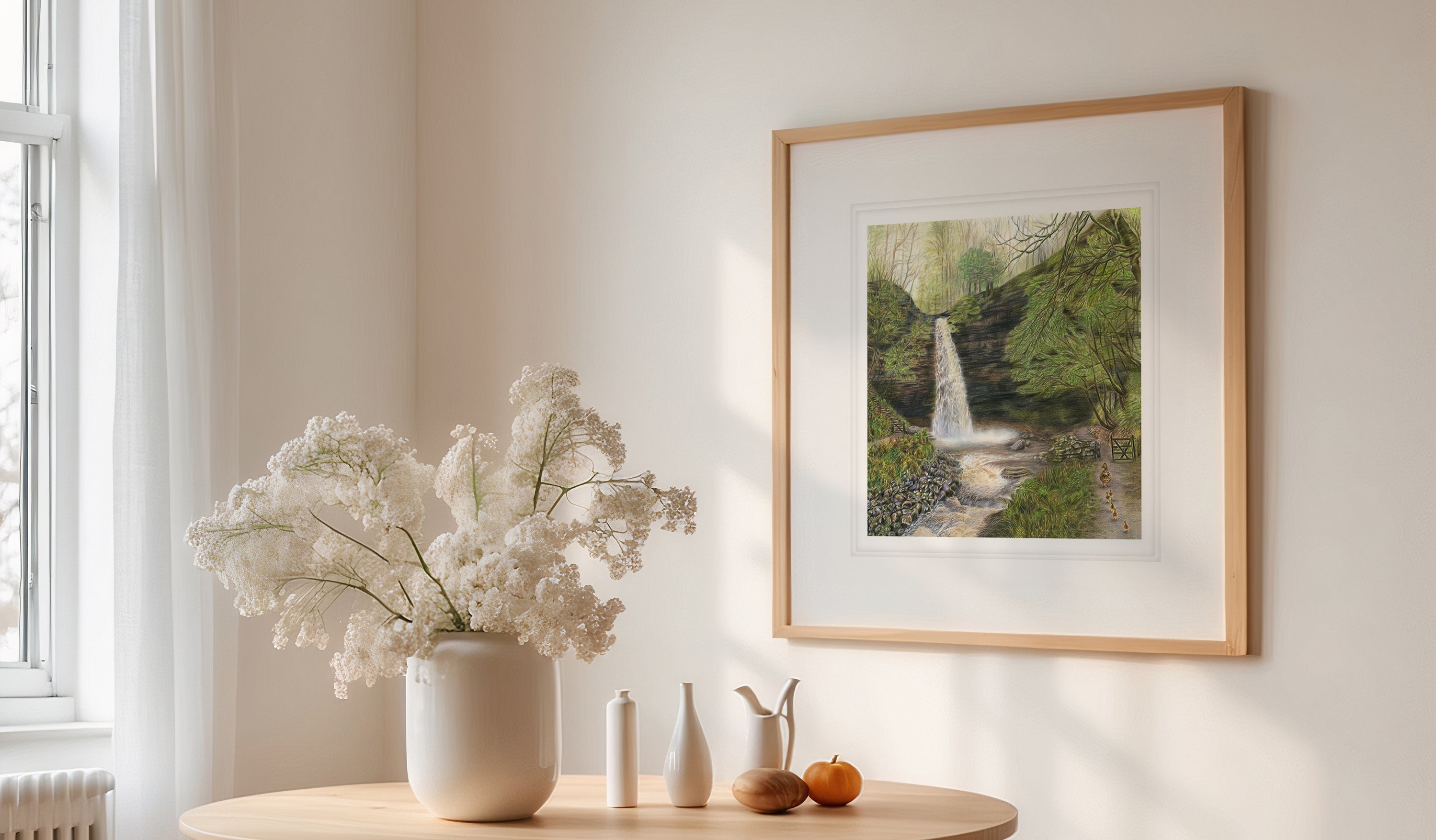 Every detail in this piece has been carefully layered to reflect the unspoilt beauty of the Yorkshire Dales. From the delicate moss clinging to ancient rocks to the soft, rhythmic movement of cascading water, I wanted to capture the essence of a place that feels both grounding and magical.